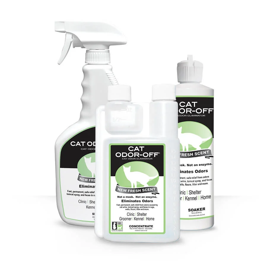Dilute 1/2 oz. of Cat Odor-Off® Fresh Scent Concentrate to 16 oz. of water in a spray or pour-on applicator.