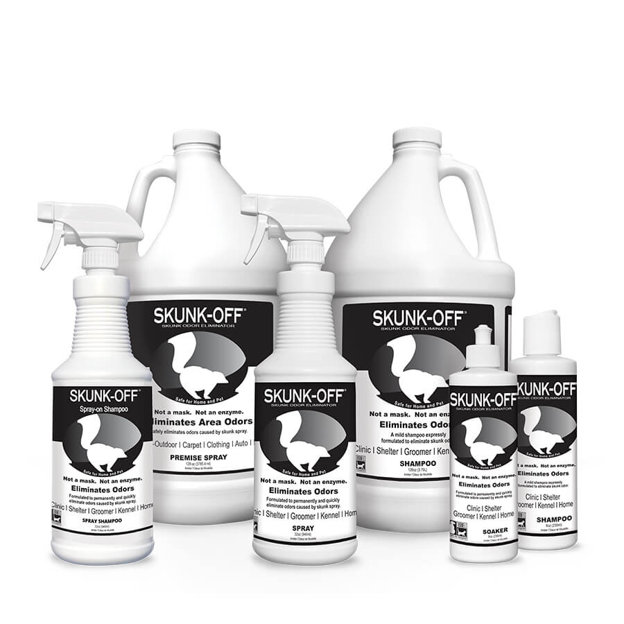 Shake bottle before using. Wipe off excess skunk spray and then saturate the entire area with Skunk-Off® shampoo or liquid paying particular attention to the area of the direct hit. Work in thoroughly. Be sure to apply to eyelids, mouth and in-between toes. Thoroughly rinse animal and dry. If odor persists, continue to reapply as necessary.